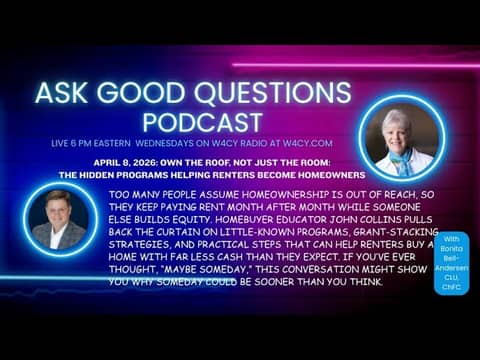 Welcome to the Ask Good Questions podcast, where Bonita Bell-Andersen leads insightful conversations around finances, retirement, investing, behavioral finance issues, and other important topics with engaging guests, all with the goal of transforming your relationship to money & finding a higher purpose for your life by beginning to "start with asking good questions." Bonita's mission: share life experiences to help you rise above the financial & behavior issues that we all experience in life.